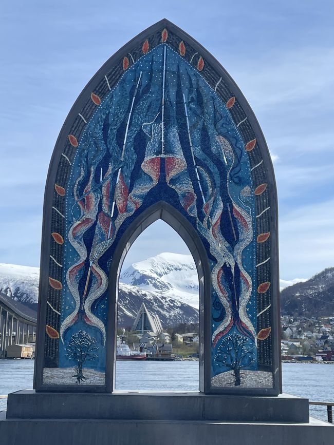 Toppbilde: Utsikt til Ishavskatedralen og Tromsdalstinden gjennom monumentet "Porten til Ishavet" av kunstneren Marit Bockelie. Foto: Ida M. Olsen