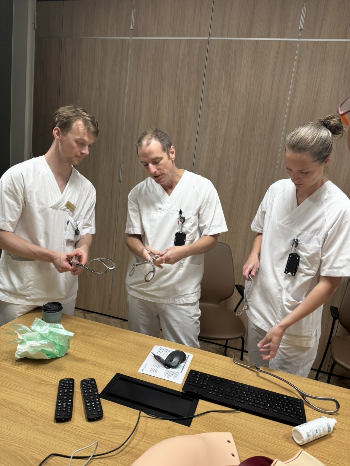 Overlege Jobe Smith instruerer LIS Elias Berdal og LIS Karen Winge i tangforløsning.