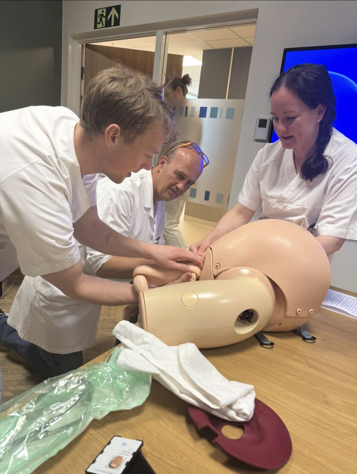 Overlegene Maarten Glas og Eeva Linna instruerer Elias i setefødsel.