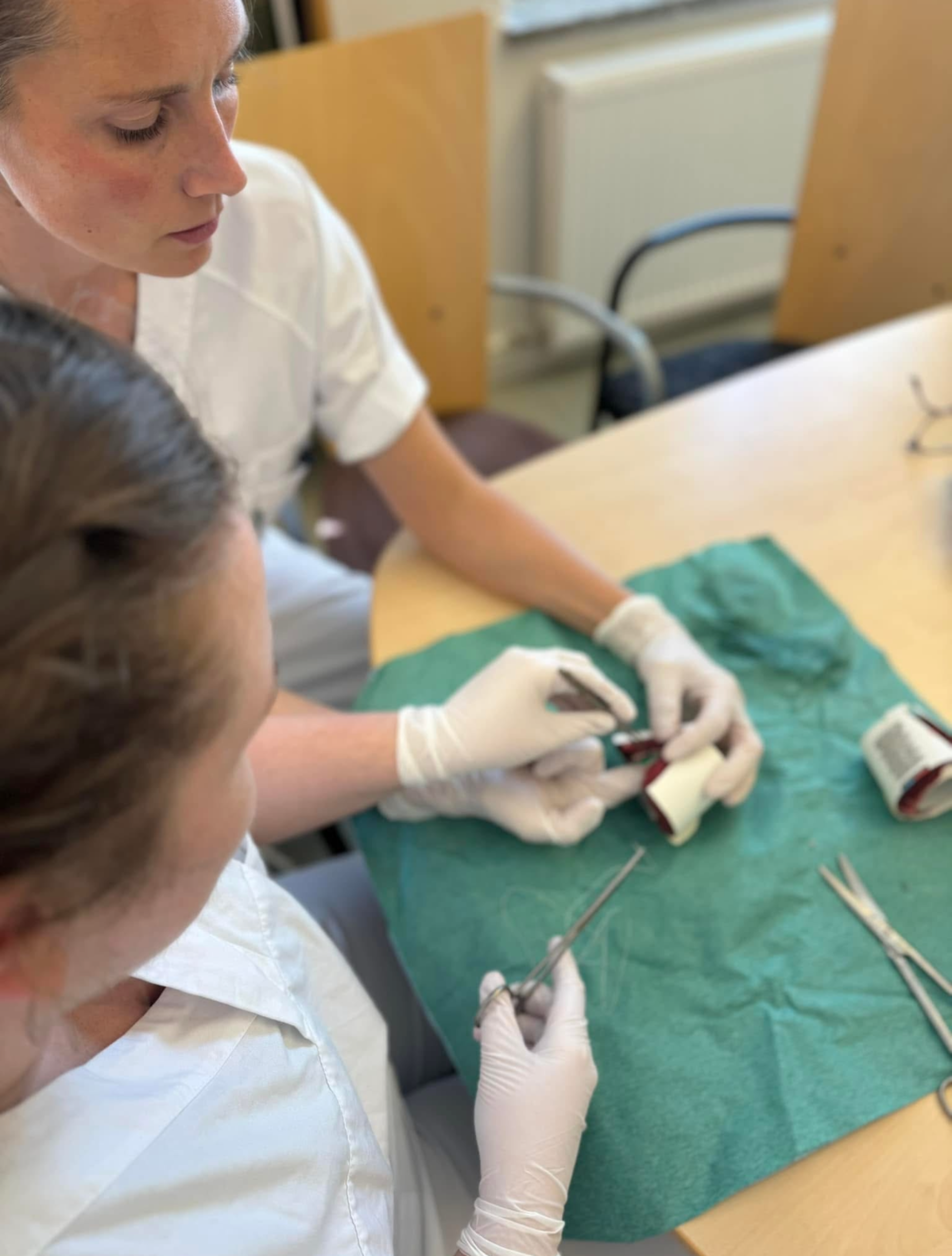 Her øves på sfinkter-suturering. LIS Linn-Siren Hausken og LIS Karen Winge.